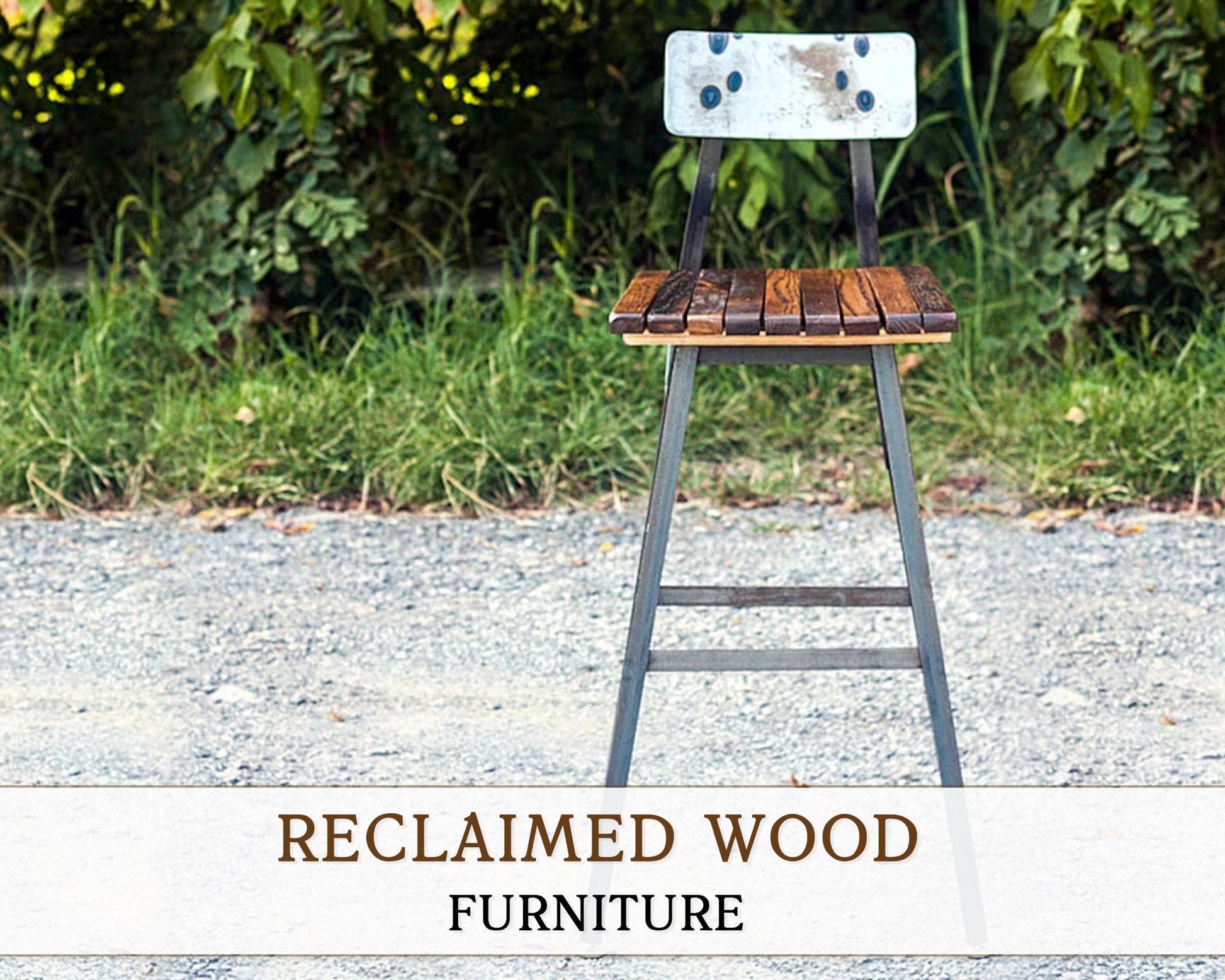 Pictured here in Oak with Provincial stain and lacquered reclaimed wood seat and raw industrial steel base at 30" high.