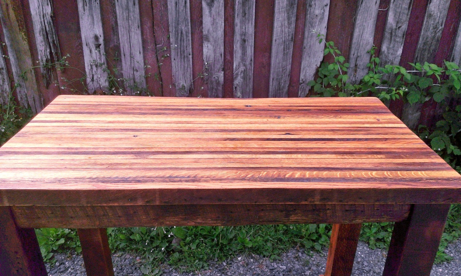 This unique Butcher Block Kitchen Island features a thick top made from a colorful selection of rustic reclaimed 1880's oak strips and sealed with multiple coats of food-grade wood oil.