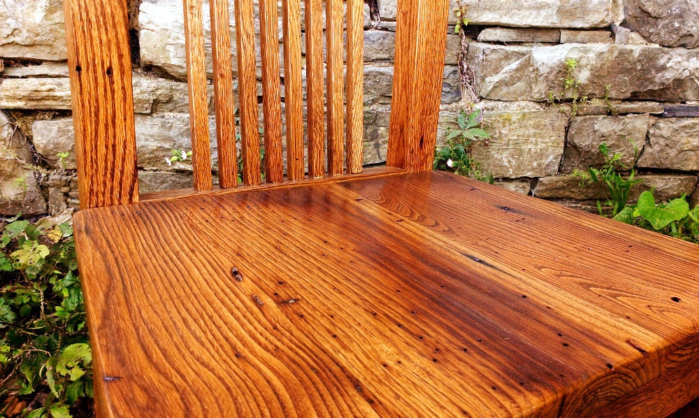 Handcrafted one at a time, these heirloom chairs are a lovely antique touch to dining room. Featured here with Early American stain and a clear lacquer finish over the old wood.