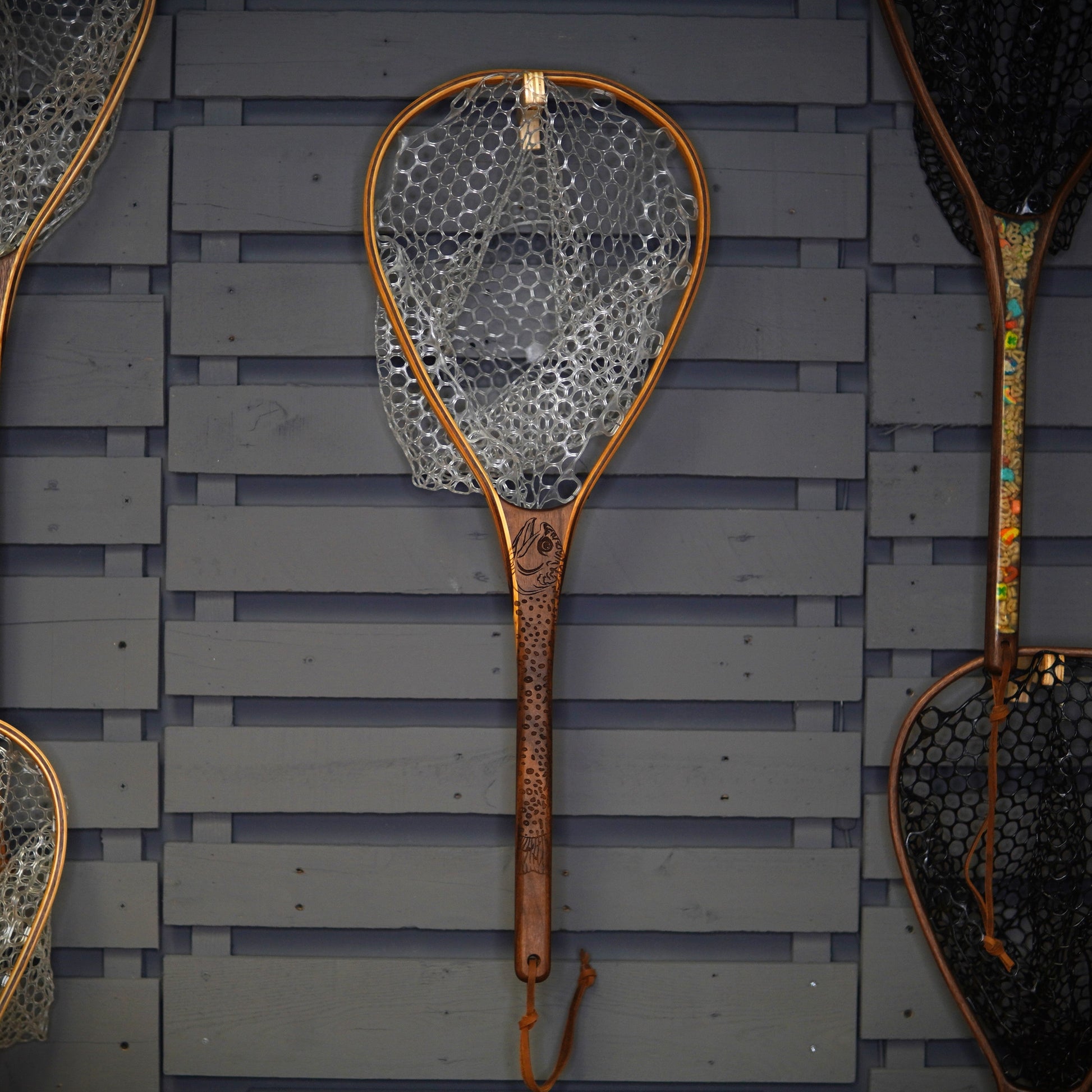 What is a Wayward Natural Landing Net? The Walnut handle is the centerpiece of the net hugged by a Hickory hoop with a Walnut pinstripe.
