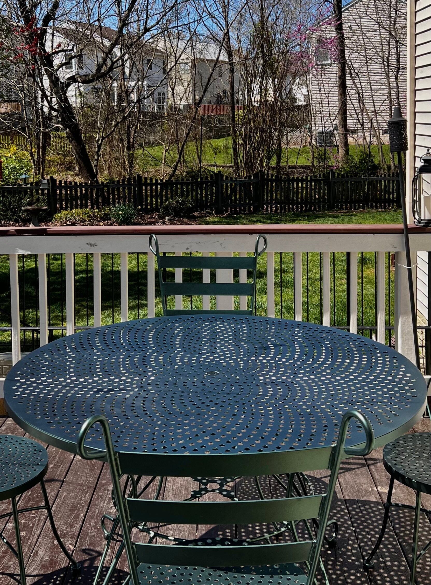 With 4 comfortable chairs and a generous 4 foot diameter table, this handmade outdoor patio set will set your space apart!