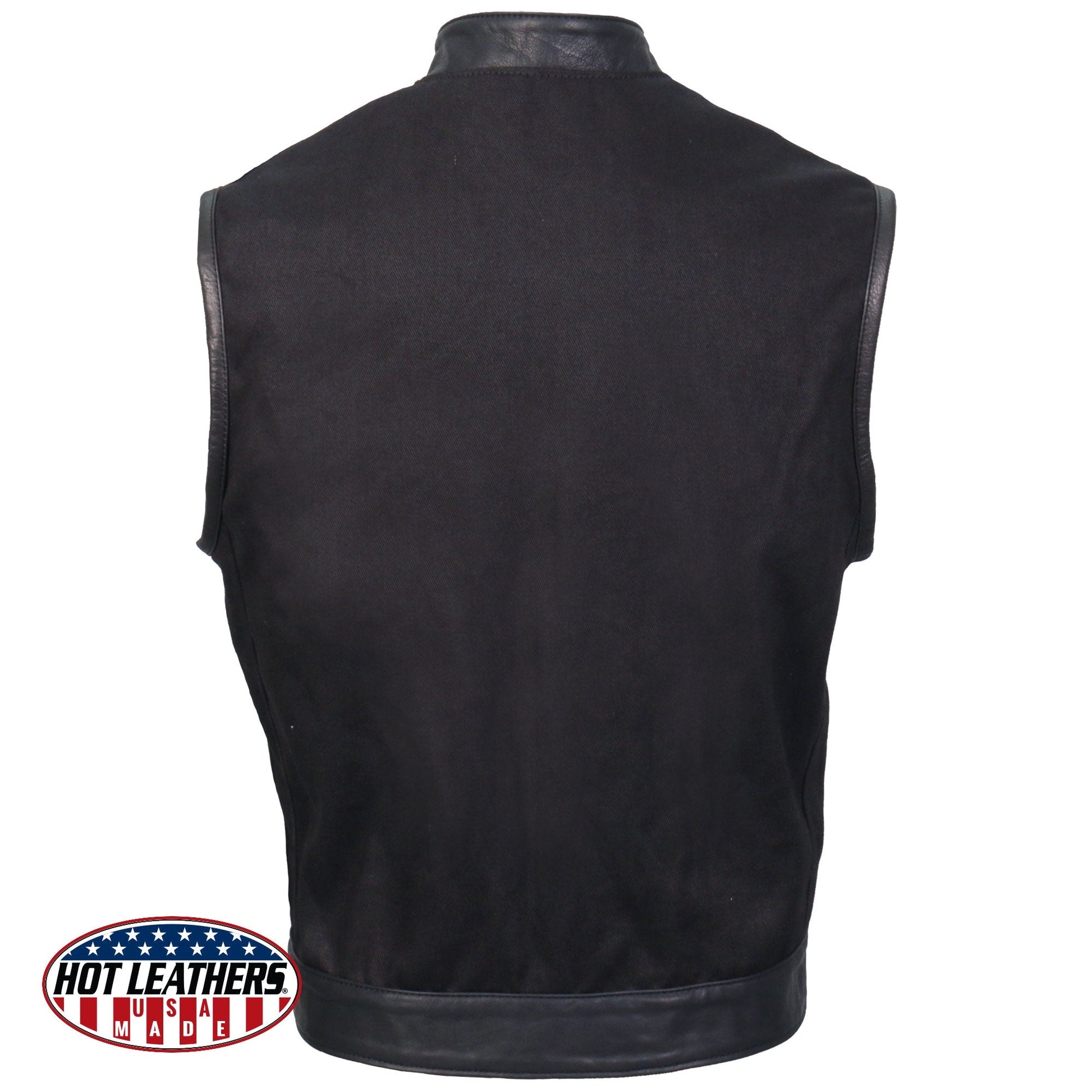 Hot Leathers all new American Made men's club style denim and leather riding vest. All Hot Leathers USA Made vests are made in-house at our facility in CT. This vest is built using heavyweight black denim and naked cowhide. This Hot Leathers denim vest is is super soft for that already broken in feel. It comes fully lined with a flannel lining. This vest has four outside and two inside storage pockets. Another great feature is a full hidden YKK Zipper and snap front. Full one piece back gives you plenty of room to have your favorite Hot leathers patches sewn on. All Hot Leathers USA Made Jacket, Chaps & Vest come with a 5 year Warranty.