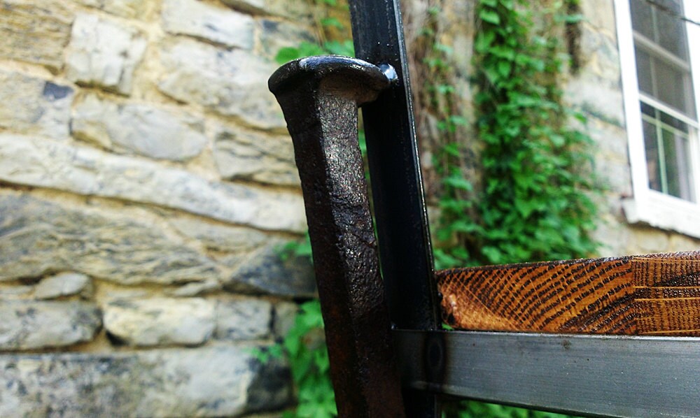 These urban style bar stools were designed for a local Motorhead-themed oyster bar - way hip! They are the perfect accent piece for your kitchen, basement bar or work desk. The welded metal frame features bent rebar supports and railroad spike footrests -- tough, durable and very cool!