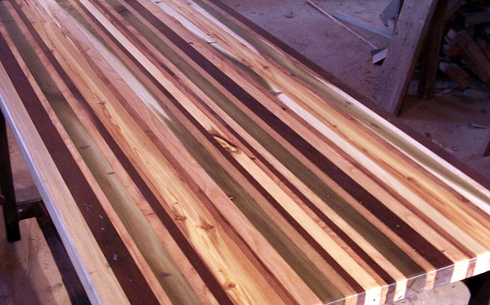 This modern mix of industrial iron and a colorful selection of reclaimed hardwoods is the ultimate butcher block kitchen island, great for prepping dinner or enjoying a slow glass of wine!