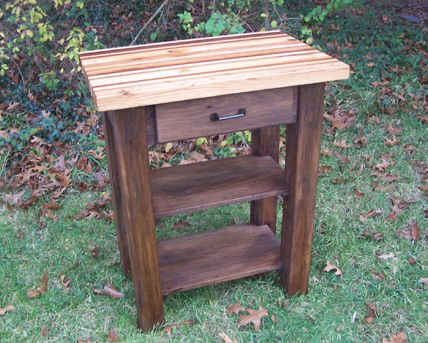 This lovely Butcher Block Kitchen Island features a 2 inch thick top made from a colorful selection of reclaimed hardwoods and sealed with multiple coats of food-grade wood oil.