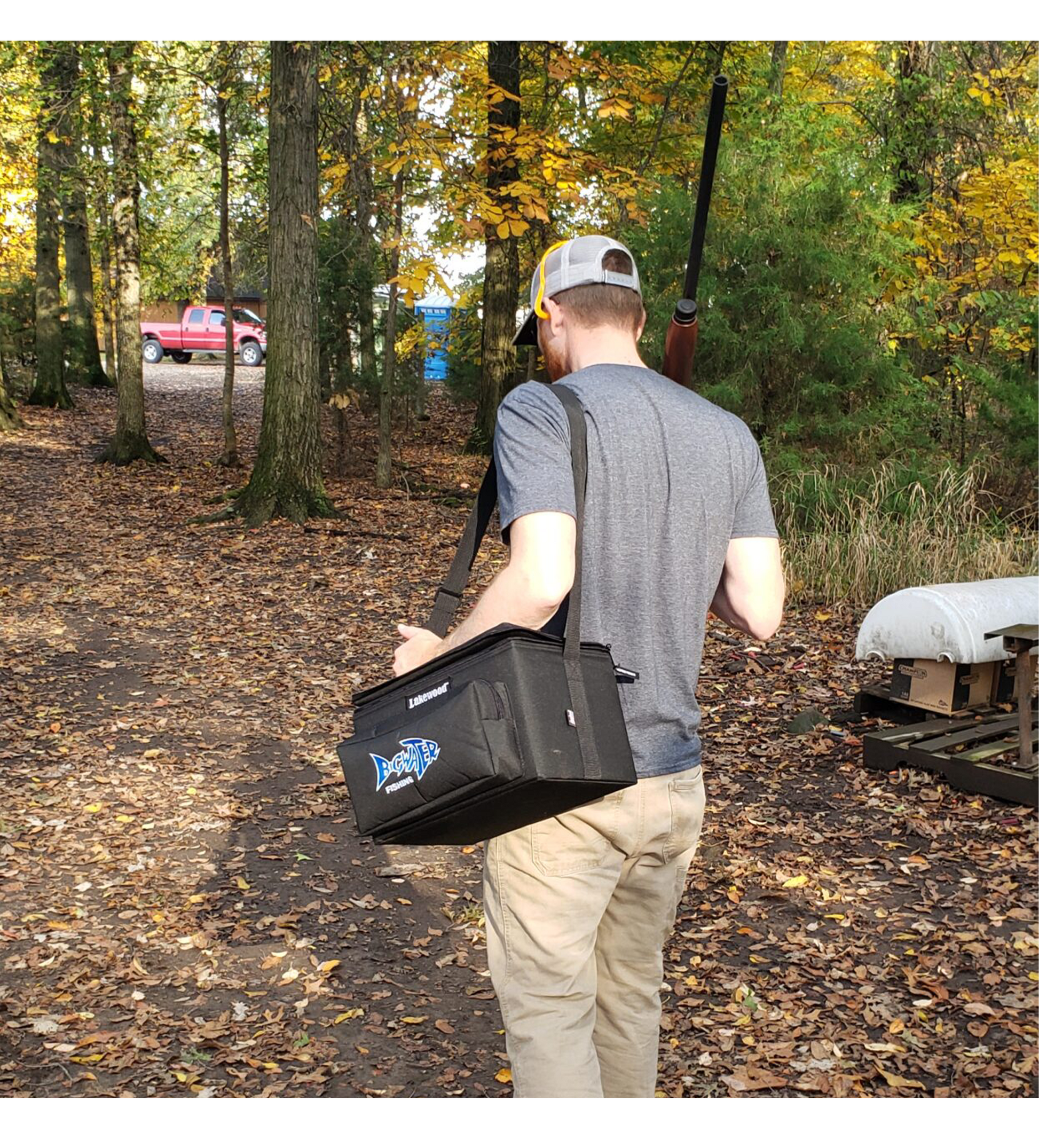 - Center compartment holds 200 empty shells, water bottles, towels, and more!