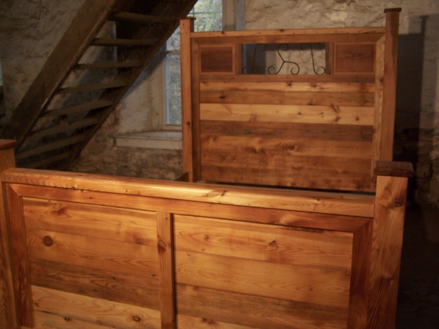 Shown here as a queen size in antique heart pine with a natural wood oil finish and 4 large storage drawers, it can be made to your custom needs with a large variety of woods, stains and storage configurations. Also available in oak, wormy chestnut and rustic style barn boards.
