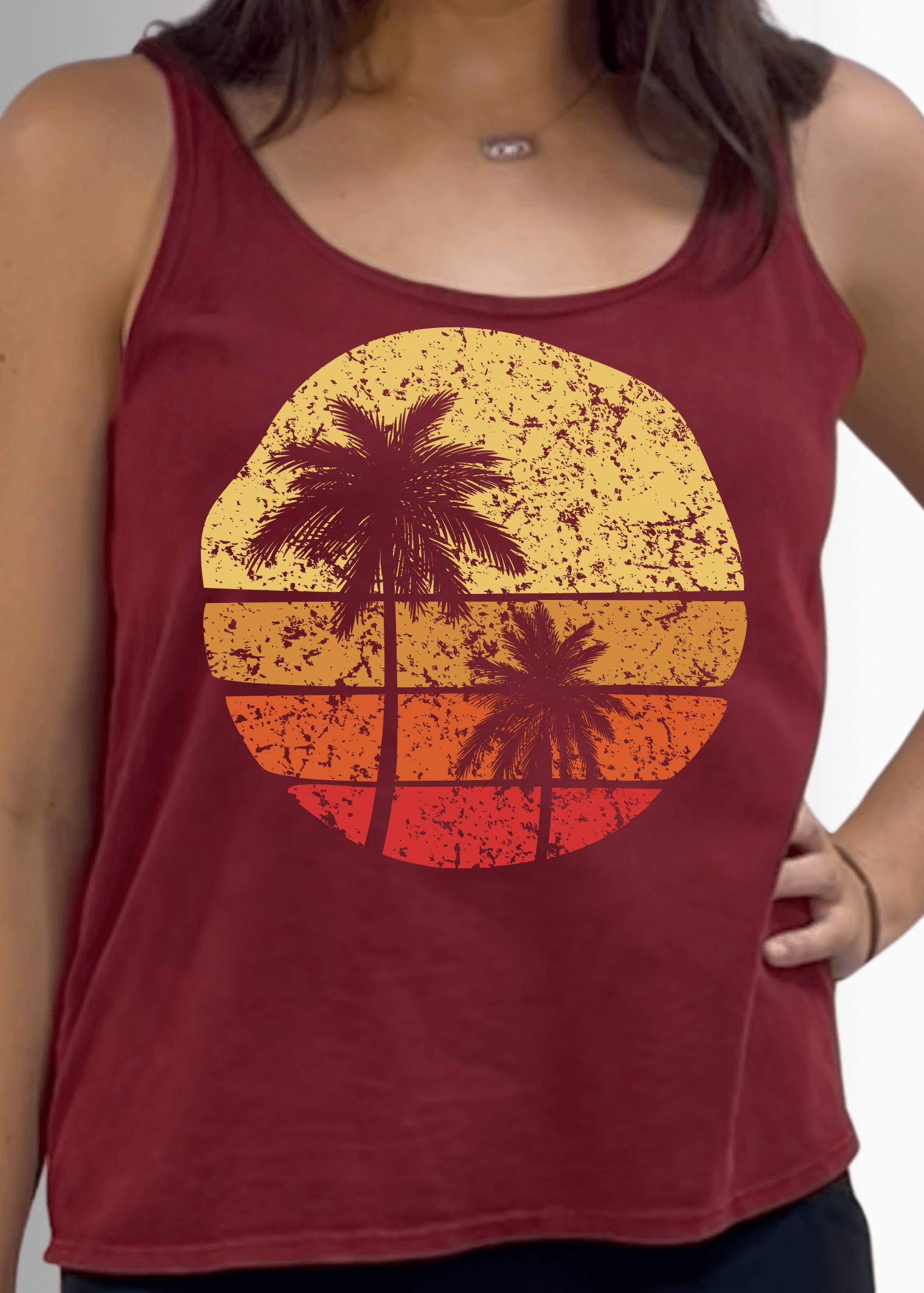 Experience all-day comfort with the Twenty Four Seven Tank Top with A Sunset Palm Tree Graphic, crafted in the USA from breathable, cozy premium USA cotton with a touch of stretch. Its mineral-washed fabric offers a vintage look, while the loose fit, wide round neck, and sleeveless design make it perfect for layering over sports bras or swim tops, or as a bottom layer under sweatshirts and jackets. Versatile enough for athletic wear, athleisure, or even bedtime, this tank combines style and comfort effortlessly. Easy care with machine wash cold and tumble dry low. Embrace comfort every day with this essential wardrobe staple. You will want one in every color. This durable premium America-made tank top is your new go-to year round!