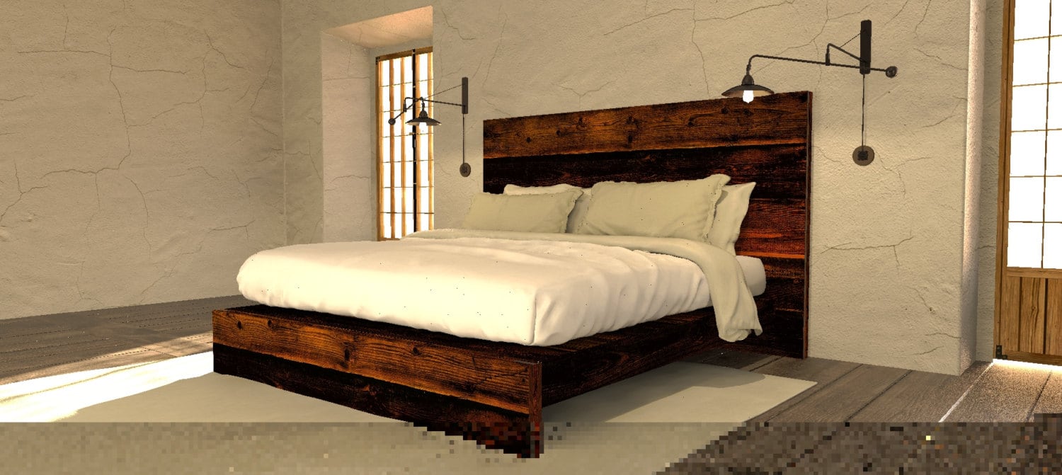 Suitable for any setting, from your uptown flat to your cabin in the woods, this bed features beautiful boards with an antique patina sanded smooth and stained dark walnut, for an atmospheric feel.
