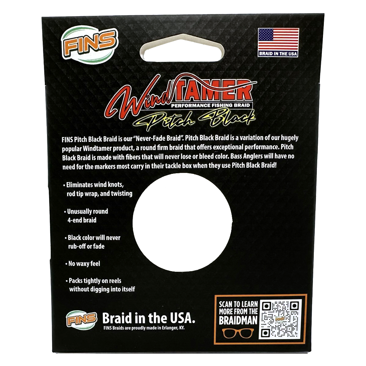 FINS Windtamer Pitch Black Braid is our “Never-Fade Braid”. Pitch Black Braid is a variation of our hugely popular Windtamer product, a round firm braid that offers exceptional performance. Windtamer Pitch Black Braid is made with fibers that will never bleed or lose color. Bass Anglers will have no need for the markers most carry in their tackle box when they use Pitch Black Braid!