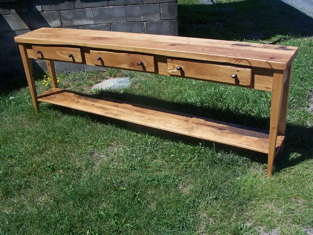This gorgeous 3 drawer sideboard made by hand from reclaimed antique wormy chestnut retains all the rustic character of the 1901 Shenandoah Valley orchard barn that it was salvaged from. Shown here with 1.5 inch thick planks and handcut walnut drawer pulls.
